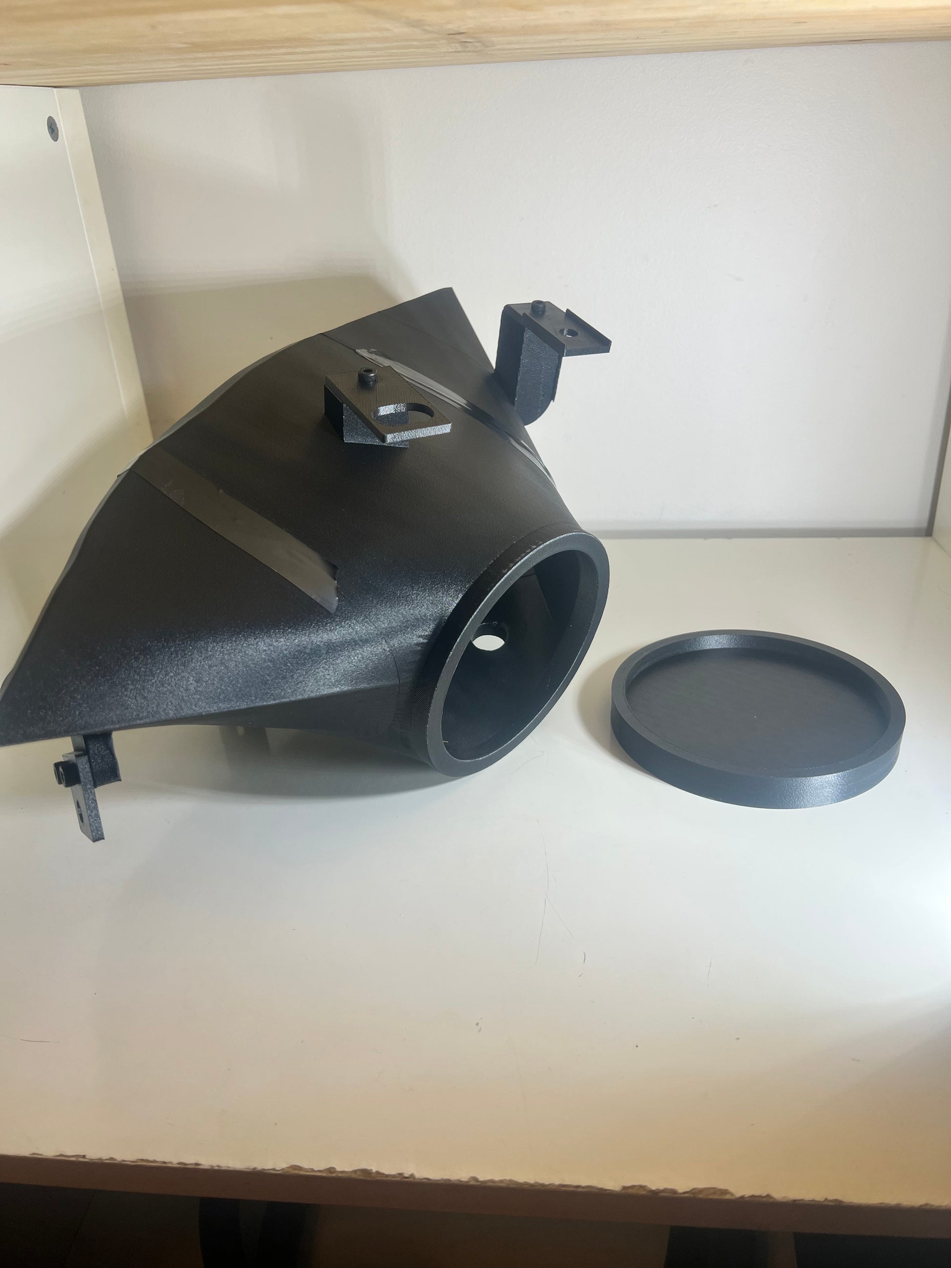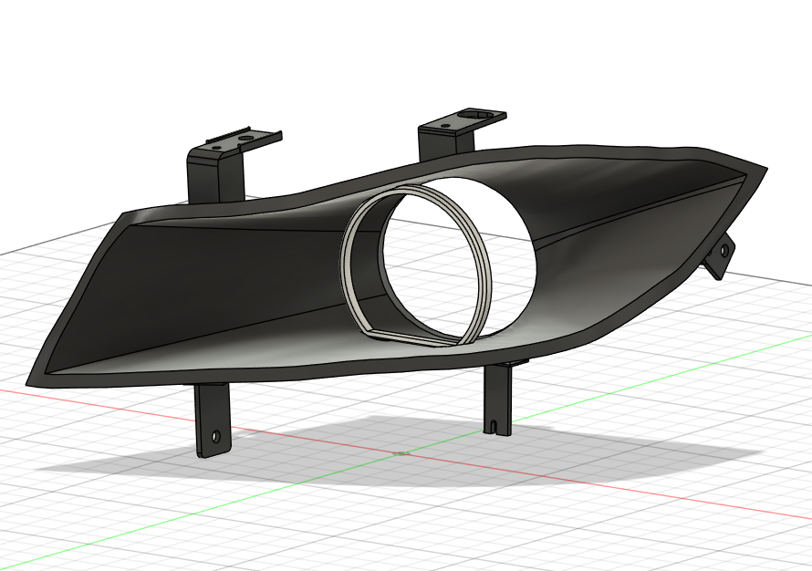 Headlight comes in 3 parts, with removal able mounting tabs and M5 threaded heat inserts for each of the tab mounts. Printed out of ASA-GF for highest UV resistance, heat resistance and glass fiber reinforcement for stiffness and strength. The 3 part body will have to bonded together with a black plastic weld or two part epoxy