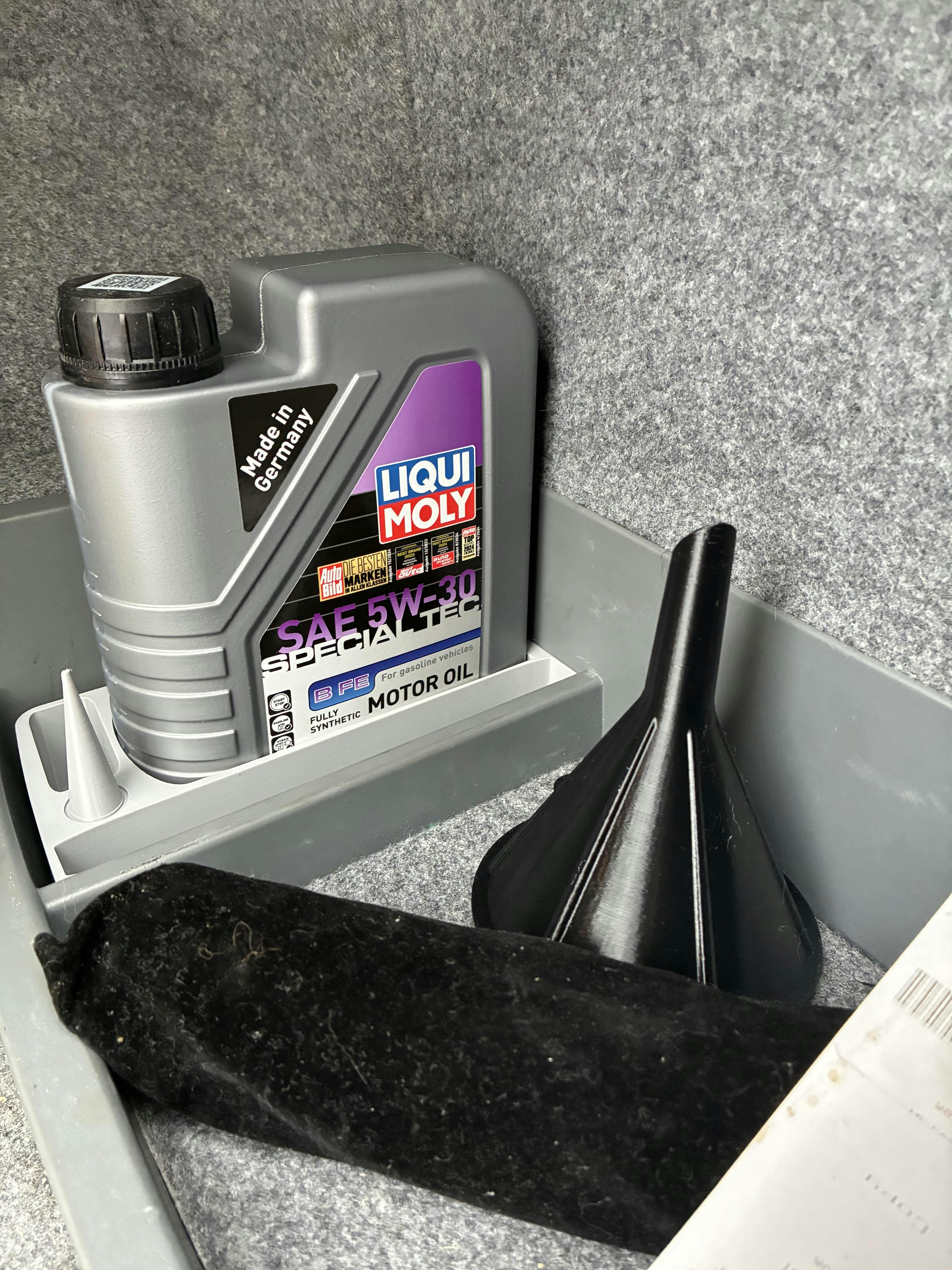 This E9X oil trunk storage will hold your LiquiMoly 1L bottle and a funnel while giving you storage space for a little organization.