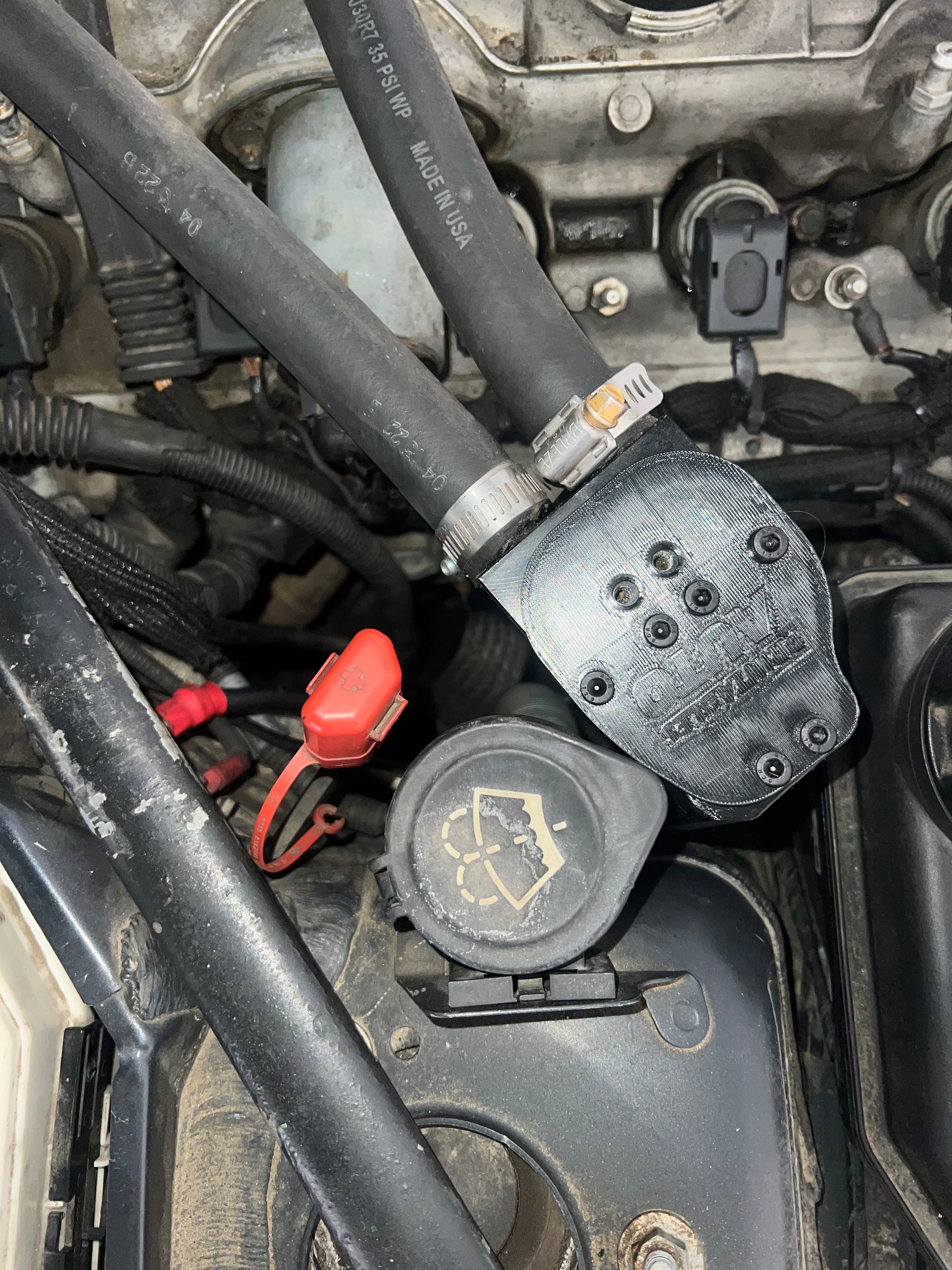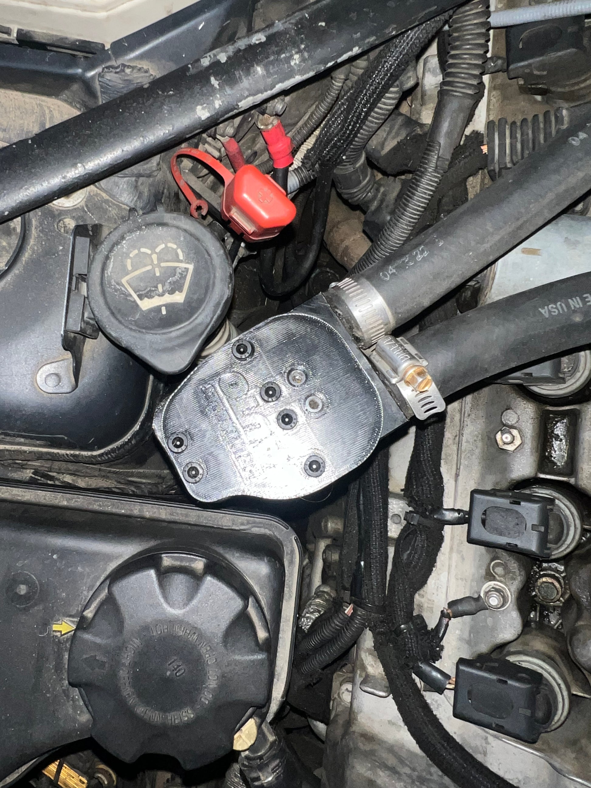The factory N54 catch can amazingly uses M5 hardware, which I love using so we made a faceplate to screw into all the holes for a solid firm connection